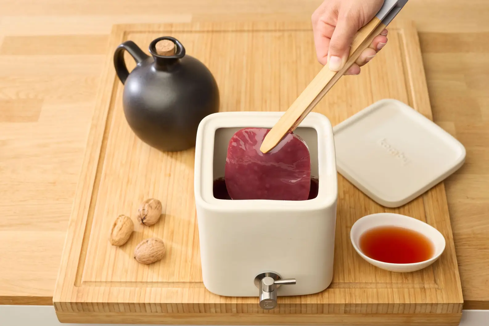 Avec Le Kube en céramique alimentaire et son robinet en inox, transformez un fond de vin en un condiment vivant, une boisson fermentée pleines d’arômes et bonne pour la santé, sans gaspillage, ni matériel complexe.